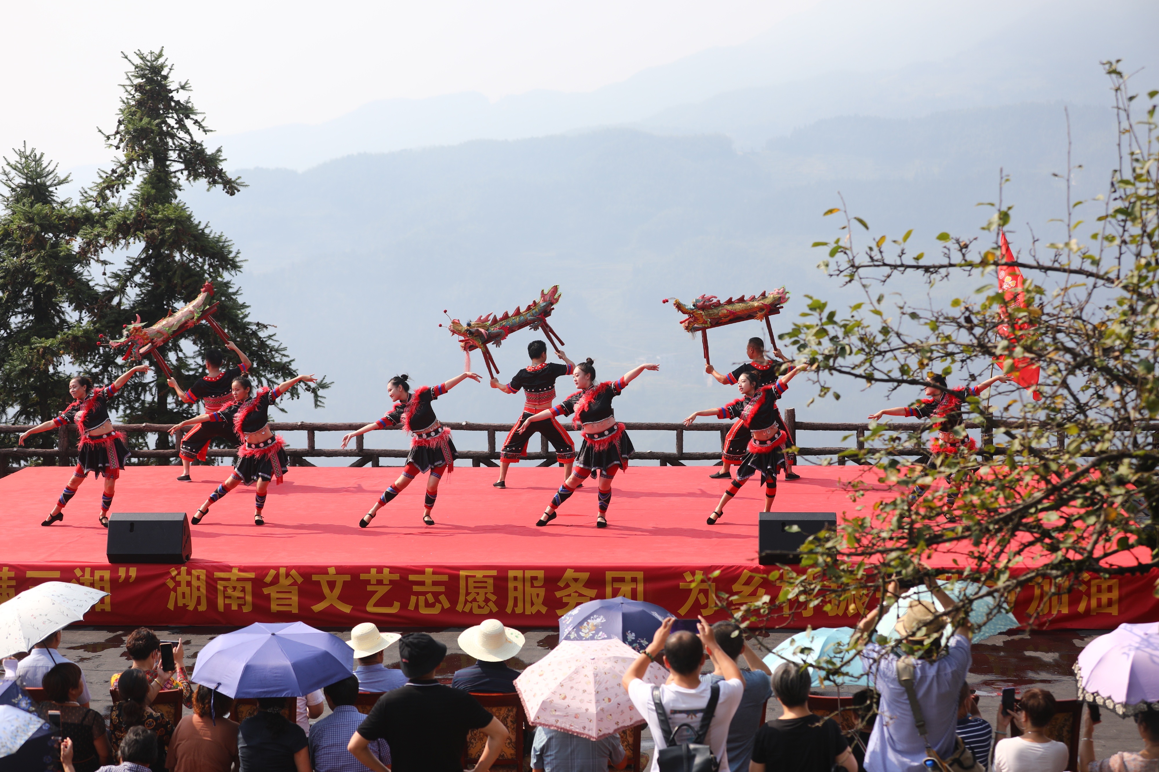 经过周密的策划和精心的组织,湘蒙两省(自治区)文艺志愿者马不停蹄的奔袭在湖南省的城市与乡村中,先后在桃江县马迹塘镇龙溪村、大栗港镇朱家村、冷水江市麻溪村、长沙市笑工场、桃花江竹海旅游区、新化县紫鹊界梯田景区、 邵阳县罗城村等地,顶着如火的骄阳奉献了七场精彩的演出。包括著名笑星、湖南省曲艺家协会主席、省文艺志愿者协会主席大兵,著名二人台表演艺术家、内蒙古曲艺家协会副主席王占昕,湖南省曲艺家协会副主席周卫星,瑶族歌唱家易秒英,苗族歌手蝶当久,蒙古族歌手娜仁图雅、莫日根巴图,曲艺演员熊壮、刁子、黄荣,青年歌手于国良、陈明,新化民歌传承人陈福云等在内的文艺志愿者和湖南省杂技艺术剧院、桃江县文艺轻骑队、冷水江群众文艺工作者、鲊埠回族乡文艺轻骑队、水车新时代文艺宣传队等倾情献艺,为广大群众奉献了呱嘴《老小王婆话脱贫》、相声《刘海砍樵》、蒙古族长调民歌《辽阔的草原》、呼麦《戈壁赞》、歌曲《一个扶贫队长的日记》、小品《我脱贫了》、长沙弹词、杂技、口技、魔术等一系列精彩的文艺节目。来自湖南、内蒙古及贵州的文艺志愿者用歌声、琴声、笑声共同唱响新时代中国乡村的赞歌,热忱讴歌了脱贫攻坚和乡村振兴战略以来祖国大地的新面貌。欢快悠扬的歌舞、诙谐幽默的曲艺、惊险柔美的杂技、惟妙惟肖的口技、变幻莫测的魔术和喜庆热闹的民俗文化表演轮番登台,每场演出都演绎得可圈可点,观众们的阵阵笑声和掌声,成为那些天里文艺志愿者们听到的最真诚、最欣慰的声音。