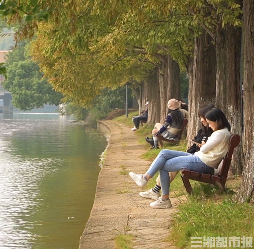 下午2时许,记者来到烈士公园内,此刻温柔的深秋感受着和煦的阳光,伴着轻柔的微风,让人不觉沉醉。作为长沙的老牌公园,烈士公园的地理位置十分优越,正值工作时间,公园内还是有不少市民散步游玩。穿过公园内湖中的长桥,迎面而来的便是满眼的金黄。而这应季的颜色也让人不住地按下手中快门。