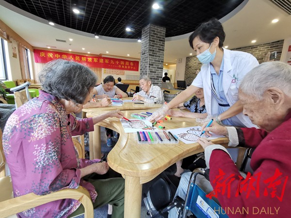9月9日,珠晖区东风街道居家和社区养老综合服务中心内,88岁的姚庄(化名)一笔一画地描摹出年轻时教书场景,“美术老师”正帮她按住画纸,耐心地教她填色、描线。