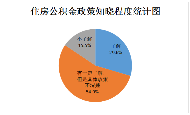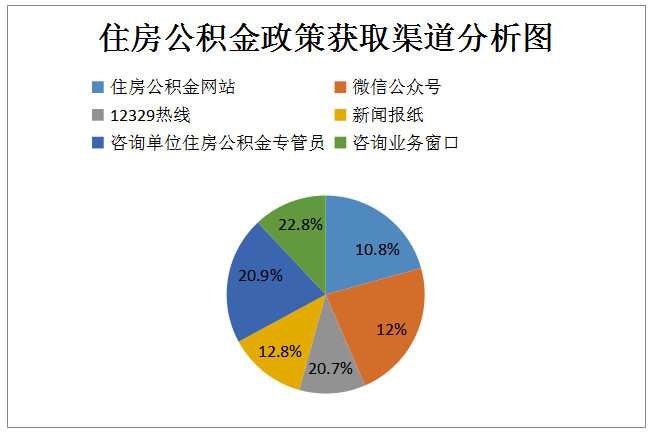 1.政策的社会知晓度不够高。郴州住房公积金目前采用的政策宣传途径主要有官方网站、微信公众号和报纸公告等,本次调研走访了郴州申湘汽车有限公司和郴州明星学校等单位,调查结果显示(图2.1),257名调查对象中,29.6%对住房公积金缴存、提取和贷款政策了解;54.9%有一定了解,但是具体政策不够清楚;15.5%对政策不了解。其中,住房公积金政策获取渠道分析图显示(图2.2),10.8%是通过住房公积金网站;12%是通过微信公众号;20.7%是通过12329热线;12.8%是通过新闻报纸;20.9%是通过咨询单位住房公积金专管员;22.8%是通过咨询业务窗口。由此可见,公积金政策的具体知晓程度并不高,同时政策的宣传渠道没有适应时代发展。