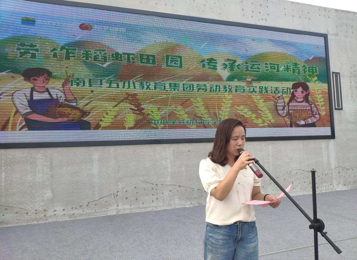 9月28日上午,师生们在基地隆重举行了“劳作稻虾田园传承运河精神”主题劳动教育实践活动开幕式。该校教务校长夏菁希望学生积极参与本次活动,自理自立,互勉互助,有所突破,有所收获;三(4)中队龙鹏乐同学作为学生代表发了言,许下了“以饱满的热情投入这次活动,用努力和汗水圆满完成活动任务”的誓言;基地教官敲响了象征丰收的丰收鼓,组织学生共同祭谷神,行献谷礼;全体师生齐诵《中国少年说》。在庄严的授旗仪式后,劳动教育实践活动就此拉开帷幕。