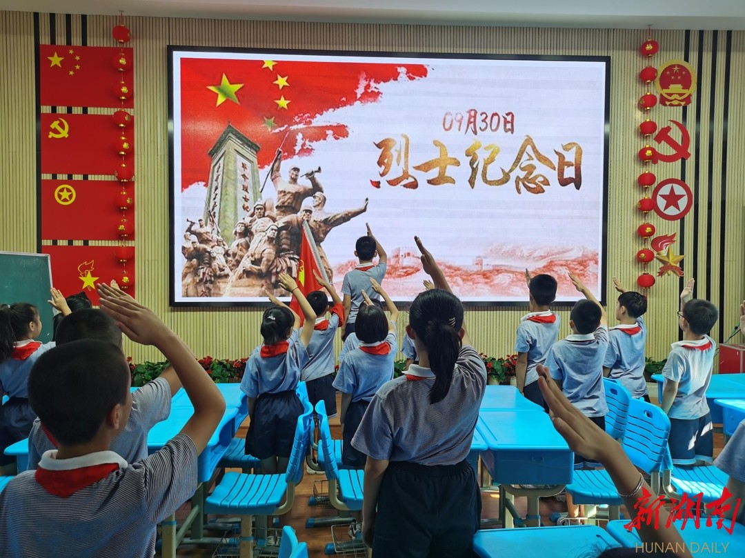 9月30日,雨花区枫树山鸿铭小学、枫树山中航城小学、五一小学、育新二小、香樟小学等几十所学校少工委组织集中收看了中央广播电视总台烈士纪念日敬献仪式直播。仪式中队员们缓缓低下头,为中国人民解放事业和共和国建设事业英勇献身的烈士默哀致敬一分钟;面向人民英雄纪念碑,高举右手,齐致队礼,唱响少先队队歌。教室内,辅导员向少先队员介绍了“烈士纪念日”的由来,队员们个个端坐凝神,认真聆听,将“请党放心 强国有我”铭记心间。
