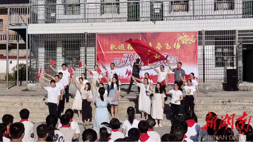 新湖南客户端10月2日讯(通讯员 陈丽辉)金桂飘香逢华诞,童声向党敬祖国。为加强爱国主义教育,庆祝新中国成立72周年,唱响爱国主旋律,营造积极向上的校园文化氛围。9月30日上午,双峰县荷叶镇荷叶中学全体师生欢聚一堂,举行了“歌颂祖国,青春飞扬”为主题的国庆歌咏比赛,以独特的方式庆祝祖国母亲的72岁生日。