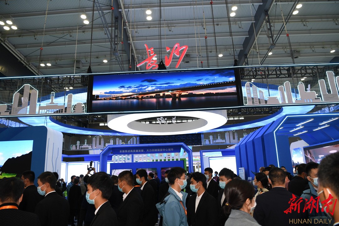 (在E1馆的 长沙展厅通过各种声光电和展板等设施设备,全面展示长沙城市建设和装配式建筑所取得的成就。)