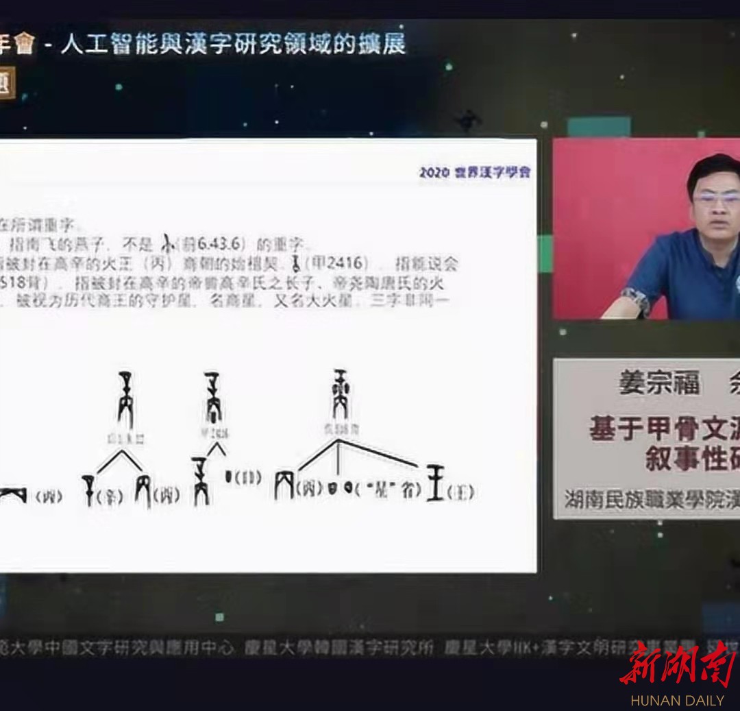 湖南日报·新湖南客户端10月31日讯(记者 徐亚平 通讯员 沈文萃 欧阳林)甲骨文是一种古老文字,龟甲上所刻的到底是啥意思?又代表了什么?10月31日,受疫情影响推迟两年召开的世界汉字学会第八届年会,在韩国延世大学线上开幕。来自湖南民族职业学院学者姜宗福、余思慧,在线首次向全世界公布甲骨文构形的8个字母,并公布了甲骨文证明夏朝真实存在的文字依据。韩国著名汉学家、延世大学教授李圭甲主持开幕式。