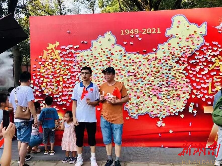 国庆节当天,岳阳楼景区内市音乐家协会的艺术家们以一首豪情万丈的《歌唱祖国》,吸引不少游客们共同参与,大家手持五星红旗,跟着节奏摇曳摆动,同唱一首歌,祝福送祖国。这些耳熟能详的歌曲,迅速点燃了大家的爱国情怀,激发了大家游玩的激情。最吸引人、参与度最高的是启发孩子爱国之心的“在中国地图上贴祝福语”的活动。大家从工作人员手中领取小卡片后,写上自己要说的话,然后将祝福语贴在中国地图上并插上小红旗。仅一天时间, “祝祖国富强”、“祝祖国万岁”等字样的卡片便贴满了整版红墙。