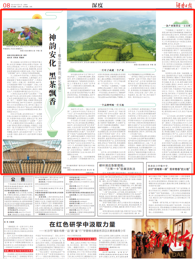 岁月沉香,历久弥新。在发展安化特色产业之初,安化就注重品牌建设。2009年,安化县成功注册“安化黑茶”商标,又先后注册“安化黑茶”地理标志保护产品,申报千两茶、花砖茶两项国家级非物质文化遗产。“安化黑茶”获“中国农产品地域品牌价值标杆品牌”,品牌价值迅速提升,目前评估价值高达639.9亿元。2020年9月,“安化黑茶”成为湖南省首批进入“中欧100+100”地标产品互认互保名单的产品;今年1月,成功获批中国海关出口HS编码,规模化出口有了自己的“身份证”。在安化黑茶这一面旗帜下,安化县已发展黑茶加工企业150余家,其中规模企业59家。