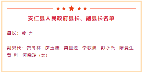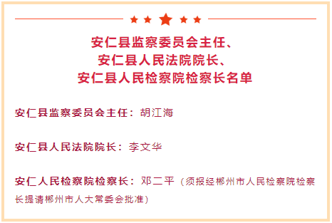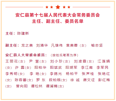 陈建新当选为安仁县第十七届人民代表大会常务委员会主任;龙之美、刘清华、凡雄伟、袁美蓉、喻志坚当选为安仁县第十七届人民代表大会常务委员会副主任;黄力当选为安仁县人民政府县长;贺冬林、廖玉康、窦显逵、李敏波、彭永兵、陈曼生、曾科、何晓玲当选为安仁县人民政府副县长;胡江海当选为安仁县监察委员会主任,李文华当选为安仁县人民法院院长,邓二平当选为安仁县人民检察院检察长(须报经郴州市人民检察院检察长提请郴州市人大常委会批准)。王丽花、尹慧、刘小珍、刘凌霞、江莲娟、许露、阳柏华等26位当选为县第十七届人民代表大会常务委员会委员。