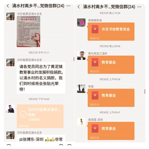 ①流动党员在微信群等平台主动领任务,捐资助学。