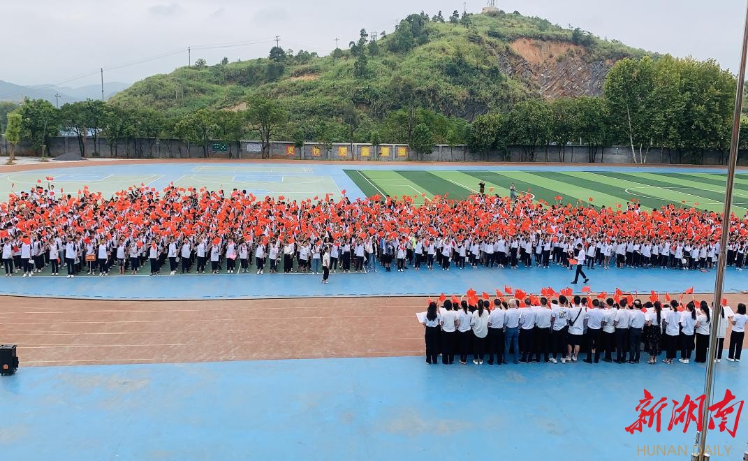 李羽蓉)9月30日上午,桂阳县第九中学举行“强国有我,请党放心”迎国庆活动,1700余名师生手持小国旗齐聚操场,礼赞伟大祖国。
