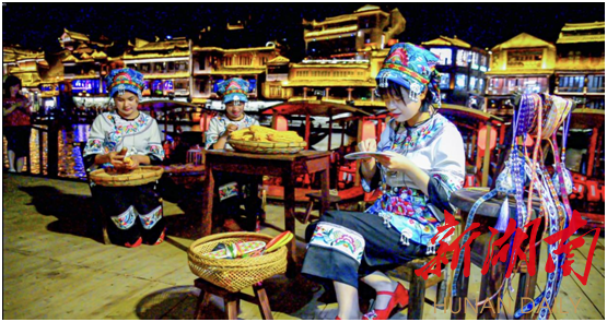 夜幕将至,华灯初上,沱江两岸在游人如织,热闹非凡。在美丽的沱江夜色之中,游客们乘着游船,感受苗族的风土人情,欣赏国风的光影科技。游客们泛舟缓缓而下,感受充满特色苗寨风情码头、唯美的翠翠竹排表演、壮阔的黄永玉百米画卷、晨光中的水上油菜花田、穿越苗族时空的虹桥隧道、龙潭渔火中爷爷的渔船、浪漫的沈从文情诗水幕、梦幻的湘见·沱江主题光影表演、震撼的苗族太阳神鼓电光秀,美轮美奂,惊艳世人、令人沉醉。