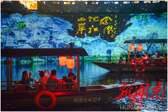 人在船上,船在水上,水在景里。来自全国各地的游客在视听盛宴中,走进文学巨匠沈从文笔下的《边城》世界,品文学经典,体验浓郁民族风俗,感受翠翠和傩送之间真挚感人的爱情故事,在流光溢彩的光影互动体验中,欣赏河上全新打造的绚烂光影效果和灵动写意的国风视听。一步一景,雾锁烟迷,恍若仙境,宛若置身于美不胜收的十里画廊中。