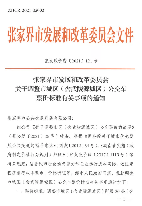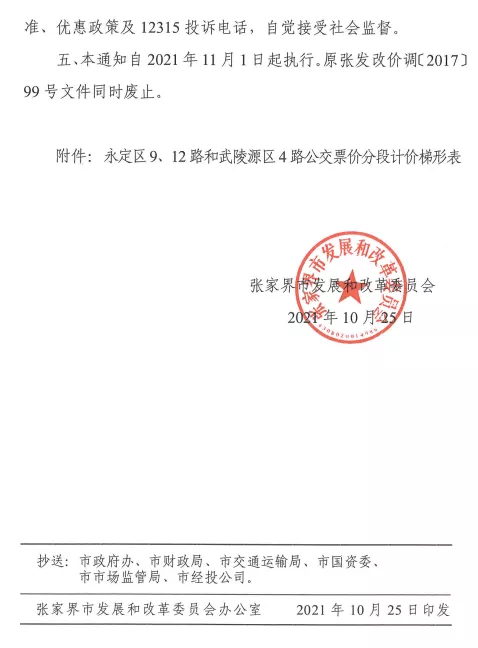 10月26日,张家界市发展和改革委员会发布《关于调整市城区(含武陵源城区)公交车票价标准有关事项的通知》。