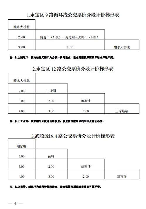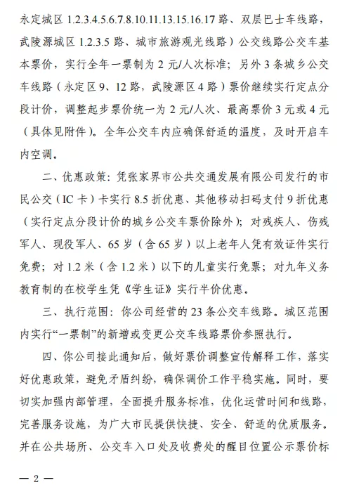 通知明确,自2021年11月1日起,张家界市城区(含武陵源城区)所属20条(含永定城区1.2.3.4.5.6.7.8.10.11.13.15.16.17路,双层巴士车线路、武陵源城区1.2.3.5路、城市旅游观光线路)公交线路公交车基本票价,实行全年一票制为2元/人次标准;另外3条城乡公交车线路(永定区9.12路,武陵源区4路)票价继续实行定点分段计价,调整起步票价统一为2元/人次,最高票价3元或4元。