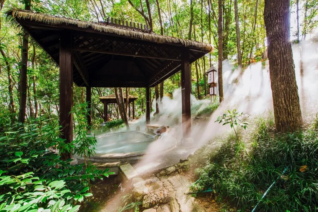 张家界万福温泉属天然自涌温泉,拥有99个风格各异、功效不同的森林氧吧泡池,温泉泉水富含氡、偏硅酸、镁、硒等多种有益人体健康的天然矿物质。