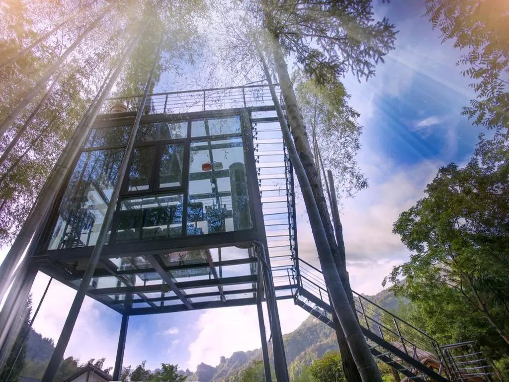 镜立方山居位于张家界森林公园门口张家界村的半山上,四周原始次森林环绕,植被茂盛,正对着张家界核心景区黄石寨。因为拥有一栋由玻璃+钢架结构建设的玻璃屋,看上去像镜子立方体而得名。