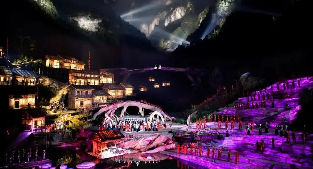 《天门狐仙》取材于民间爱情传说《刘海砍樵》,以天门山奇峰峡谷为背景,花1.5亿打造,是全球首个且唯一在山水实景中演出并有完整故事情节的音乐剧。