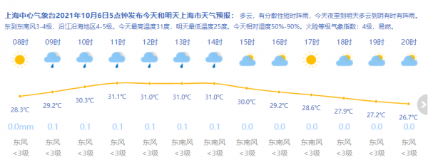 上海中心气象台2021年10月6日5点钟发布今天和明天上海市天气预报:多云,有分散性短时阵雨,今天夜里到明天多云到阴有时有阵雨。东到东南风3-4级,沿江沿海地区4-5级。今天最高温度31度,明天最低温度25度。今天相对湿度50%-90%。火险等级气象指数:4级,易燃。