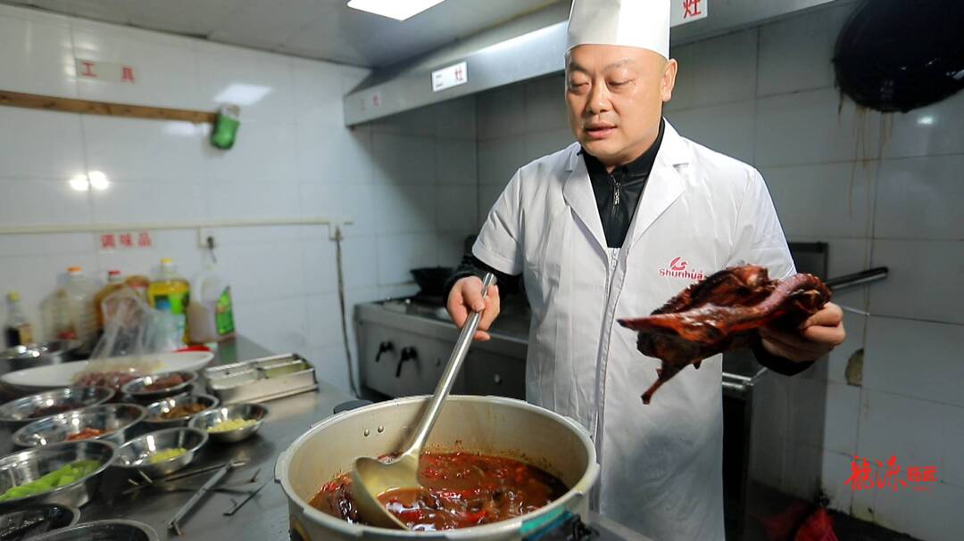 这天,临武舜华鸭业金牌厨师袁新涛要接待一群广东过来的朋友,他打算做一桌全鸭宴。在全鸭宴中,袁新涛最擅长的就是酱板鸭。要做好酱板鸭,选材是关键的第一步。“这个鸭掌比较厚,有茧子的这种鸭子,做出来的酱板鸭是非常的美味,非常的有嚼劲。”一大早,袁新涛就到山上去抓鸭子,而鸭的挑选也是十分的讲究,必须要养殖75天以上的公鸭。