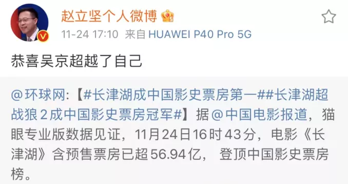 而此前一天(11月24日),据猫眼专业版数据,《长津湖》含预售票房就已超56.94亿,登顶中国影史票房榜。外交部发言人赵立坚转发了相关消息,恭喜吴京超越了自己。