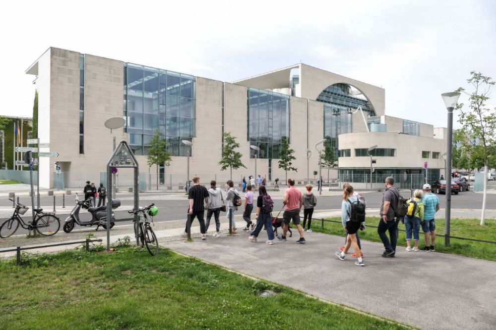 8月10日,行人经过位于柏林的德国总理府。(新华社发,斯特凡·蔡茨摄)