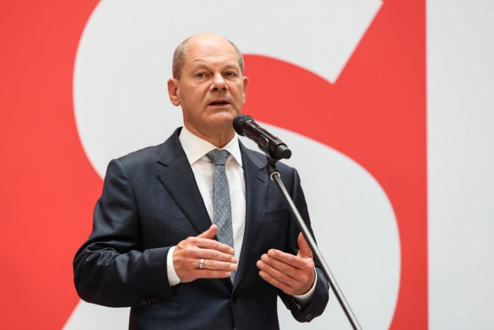 9月27日,在德国首都柏林的社民党总部,社民党总理候选人朔尔茨出席新闻发布会。(新华社记者单宇琦摄)