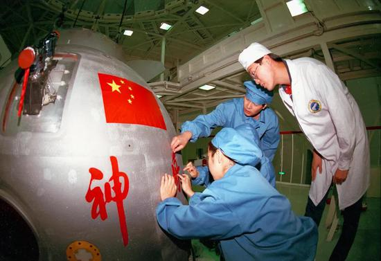 科技人员为“神舟一号”飞船绘上“神舟”字样