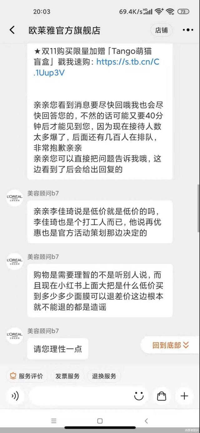 而据网友提供的截图显示,欧莱雅旗舰店官方客服曾经如此回应消费者提出的差价争议:“李佳琦说是低价就是低价的吗,李佳琦也是个打工人而已,他说再优惠也是官方活动策划那边决定的。”