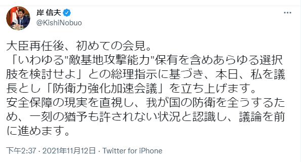 日本防卫大臣岸信夫12日在推特上称,第2次岸田内阁成立后,自己首次召开记者会。他声称遵循首相岸田文雄“考虑包括获得所谓‘对敌基地攻击能力’等任何手段”(实现军扩)的指示,即日设立所谓“防卫力强化加速会议”,并由自己担任负责人。岸信夫还声称,“当前日本安全保障形势“刻不容缓”,将推进(在增加防卫预算方面上的)议程进展”。