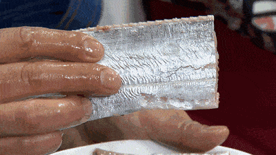 这层白色鱼皮是带鱼的“银脂”,它也被成为“银鳞”,银鳞不是鱼鳞,它是一层由特殊脂肪形成的表皮。