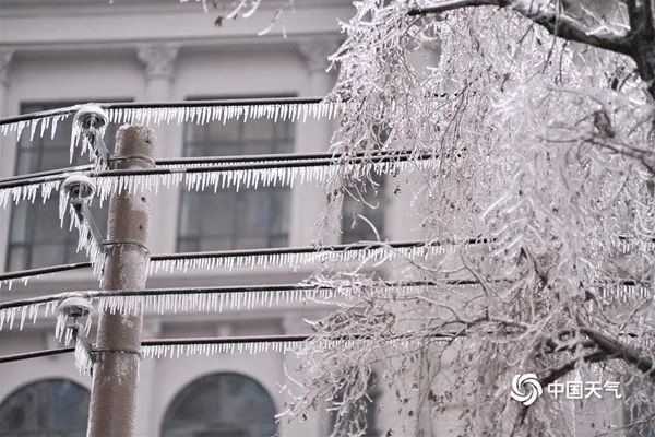 哈尔滨冻雨,积冰覆盖树枝、电线。