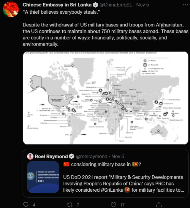这条推文中,驻斯里兰卡大使馆开篇就表示:“‘小偷看谁都是小偷’。”随后,提及反而是美国拥有数量众多的海外军事基地,大使馆表示:“尽管美国的军事基地和军队已从阿富汗撤出,美国仍在海外维持着约750个军事基地。这些基地在很多方面花销巨大:经济上、政治上、社会和环境上。”↓