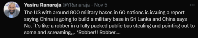 和中国驻斯里兰卡大使馆类似,也有网友比喻称:“在60个国家拥有大概800个军事基地的美国,发布报告称中国将在斯里兰卡建立军事基地,中国对此否认。这就像一个强盗在一个挤满人的公交车里,突然指向其他人,大喊‘有抢劫的’‘有抢劫的’...”↓