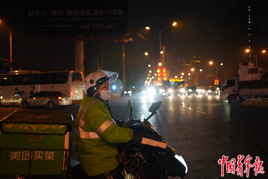 2021年春节期间,一名外卖骑手正在送餐。