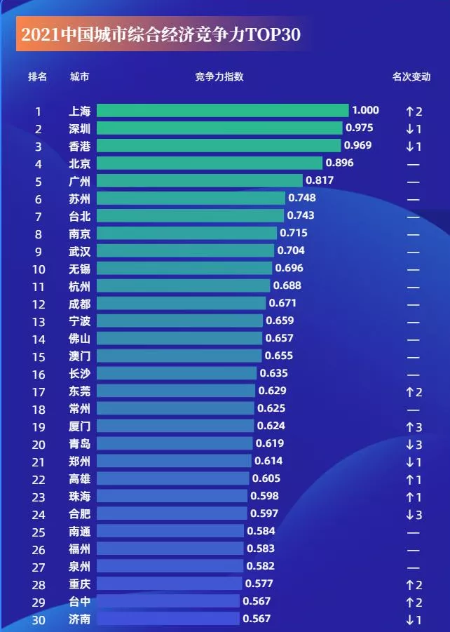 根据报告,2021年综合经济竞争力排名前10城市依次为:上海、深圳、香港、北京、广州、苏州、台北、南京、武汉、无锡;11-20名依次为:杭州、成都、宁波、佛山、澳门、长沙、东莞、常州、厦门、青岛。
