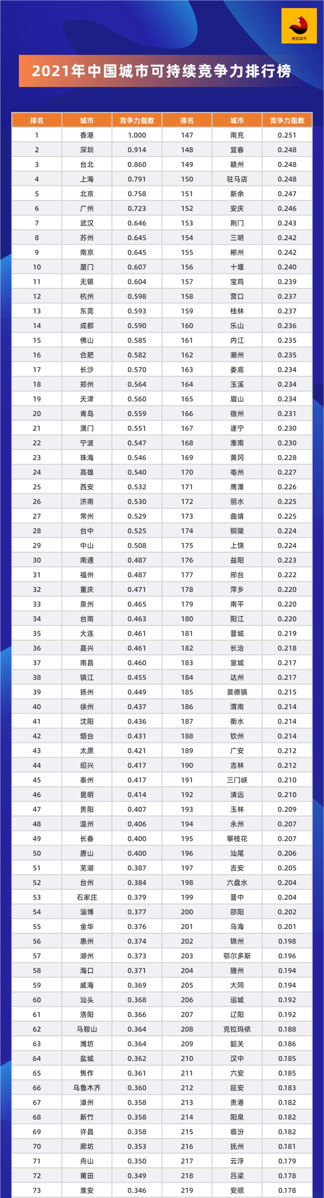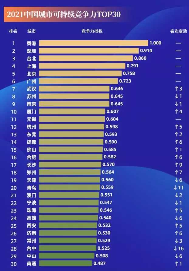 可持续发展,是全球城市面临的永恒课题。报告显示,2021年中国城市可持续竞争力排名前20的城市分别为:香港、深圳、台北、上海、北京、广州、武汉、苏州、南京、厦门、无锡、杭州、东莞、成都、佛山、合肥、长沙、郑州、天津、青岛。其中,中西部城市可持续竞争力排名上升较快——成都上升6名、合肥上升6名、长沙上升9名、郑州上升7名。