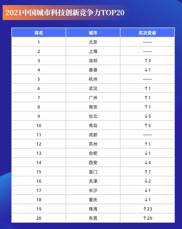 科技创新竞争力,衡量城市的科创能力。报告显示,2021中国城市科技创新竞争力排名前20的城市分别是:北京、上海、深圳、香港、杭州、武汉、广州、南京、台北、青岛、程度、苏州、合肥、西安、厦门、天津、长沙、重庆、珠海、东莞。总体来看,20强城市基本上都是高等教育重镇或高新技术企业集聚的大城市。