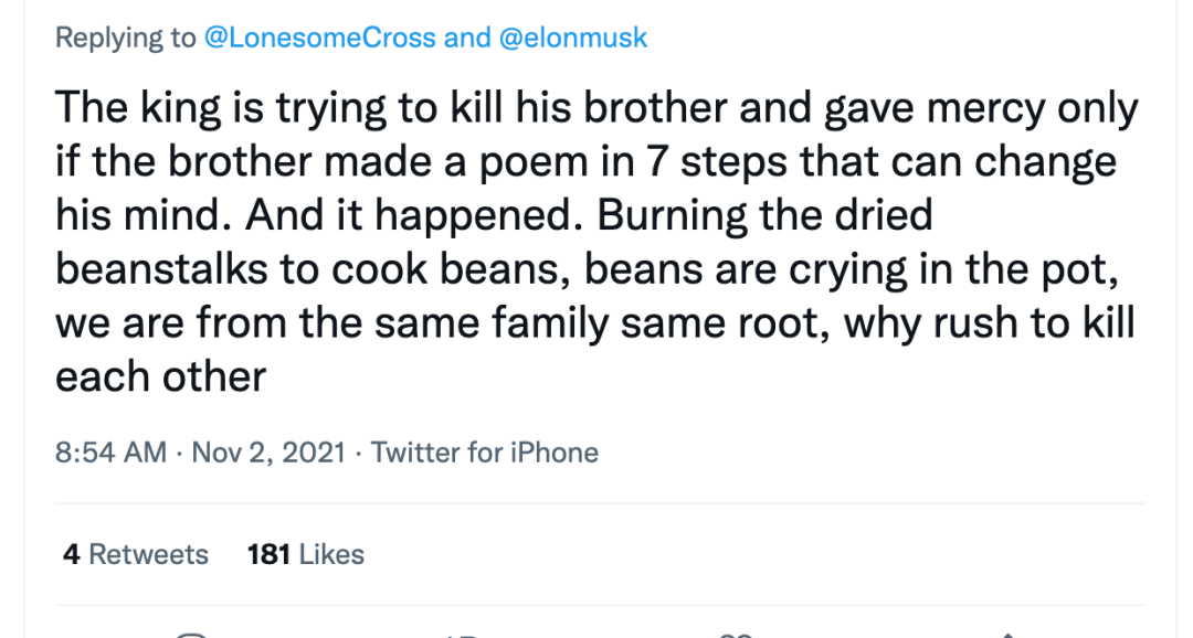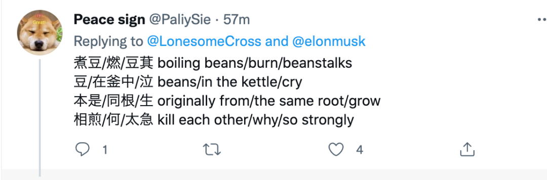 然后,这样一位全球首富今早在twitter上发了一首中国古诗,曹植的《七步诗》: