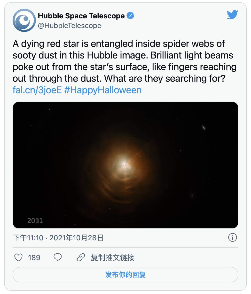据了解,这颗红巨星实际上是一颗“碳星”,而其周围的“蜘蛛网”实际上是被吹离的像"煤灰"的大气层。当它们扩展到空间时,它们会改变形状。欧洲航天局周四在一份声明中说: “橙红色的‘蜘蛛网’是吞噬这颗垂死恒星的烟尘碳云。它们是由红巨星CW Leonis的外层被吸进漆黑的虚空中创造出来的。”