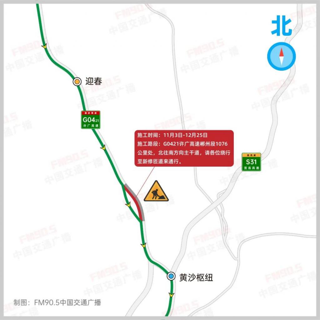11 月 3 日,记者从湖南省高警局郴州支队、中交第四航务工程局有限公司临连高速公路项目部了解到,为保障许广高速主线连接临连高速施工期间的安全畅通,将分阶段对 G0421 许广高速郴州段 1076 公里处进行施工,郴州高速交警也将视情况对该路段进行管制。