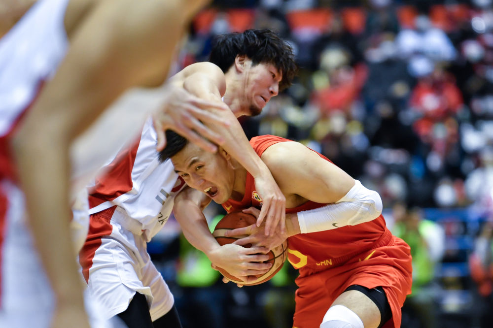 ↑ 中国队球员张镇麟(左)与日本队球员竹内公辅在比赛中拼抢。