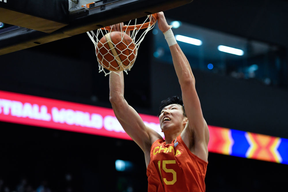 ↑ 中国队球员周琦(右)在比赛中拼抢。