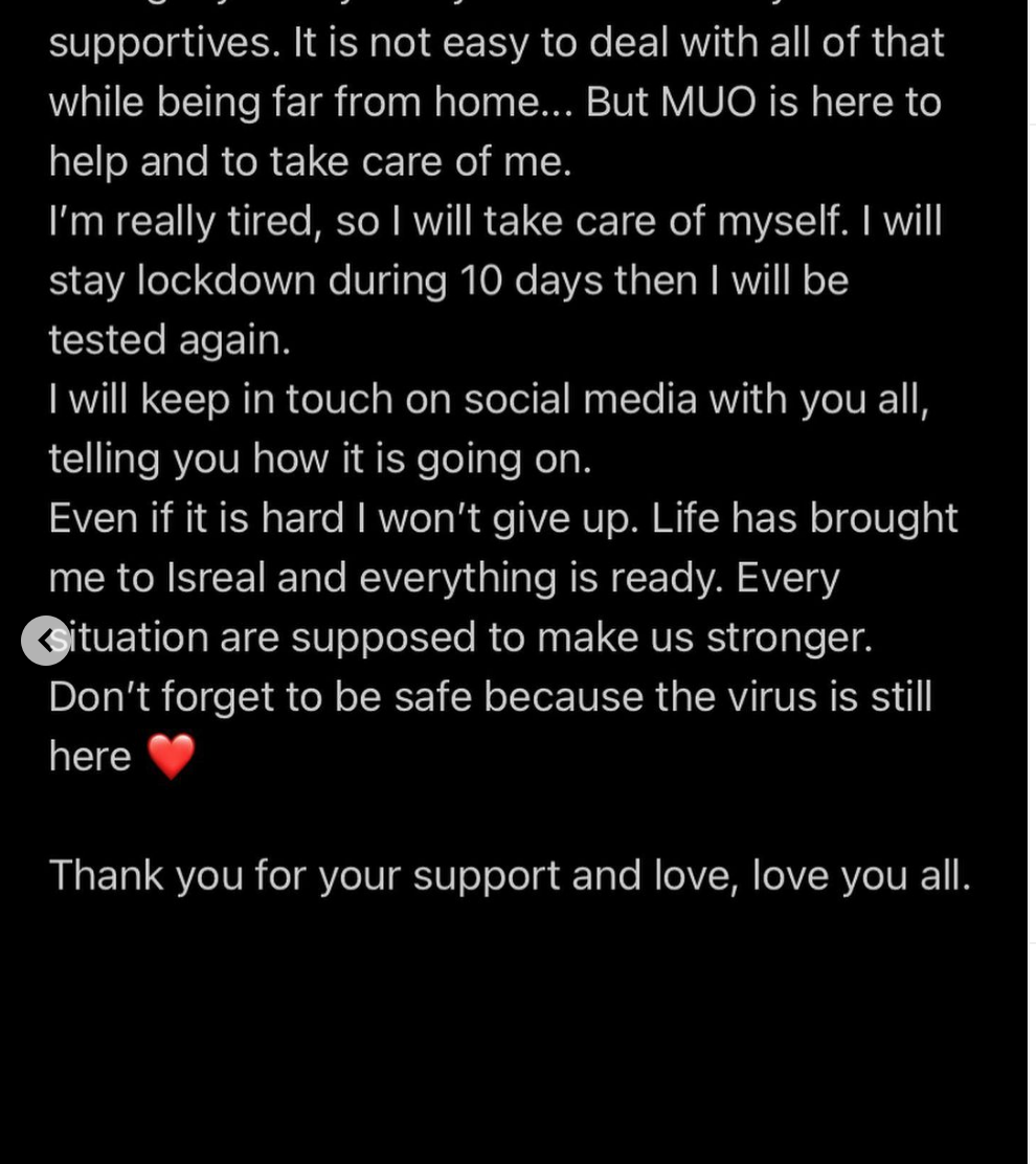 Clémence表示自己将会未来10天自我隔离,然后再接受下一次检测,最后她也感谢了大家的爱与支持。