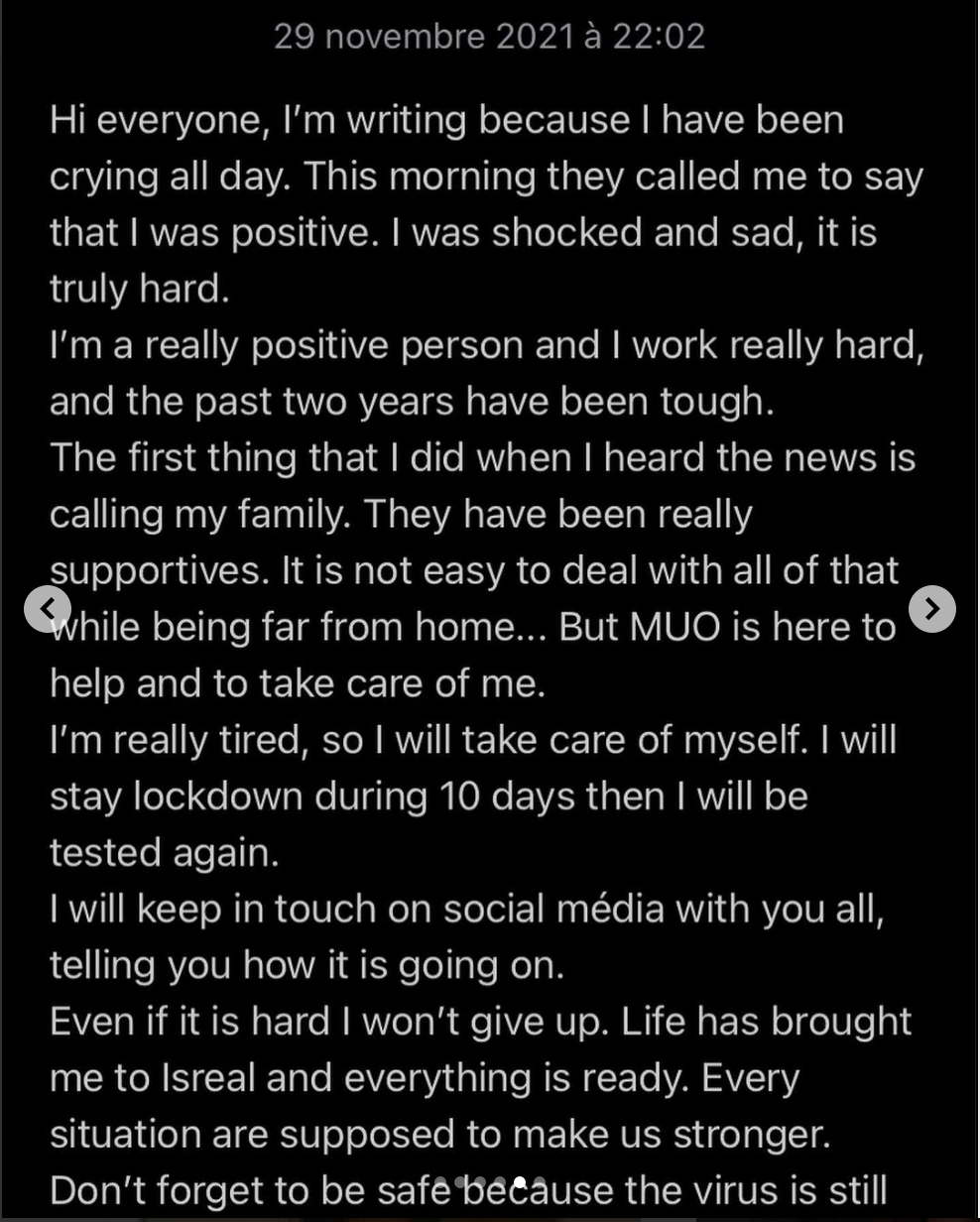 随后,Clémence Botino自己也在ins上发了英法双语版的长文,表达了自己在得知这个结果后的震惊和悲伤,“今天一早我被通知检测结果是阳性时,我感到震惊和难过,真的太难了。”