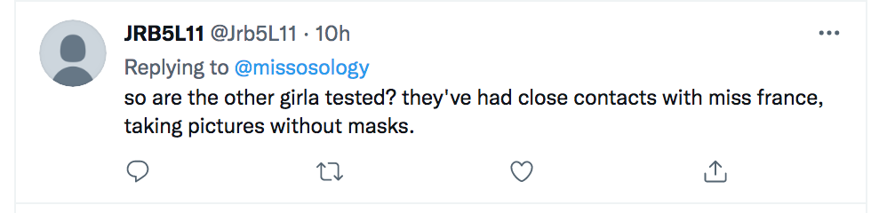 比如就在昨天,社交媒体上传出的活动图中可以看到,来自各国的佳丽们还是合影,没有任何的防护措施,而最右的就是刚查出阳性的Clémence Botino......