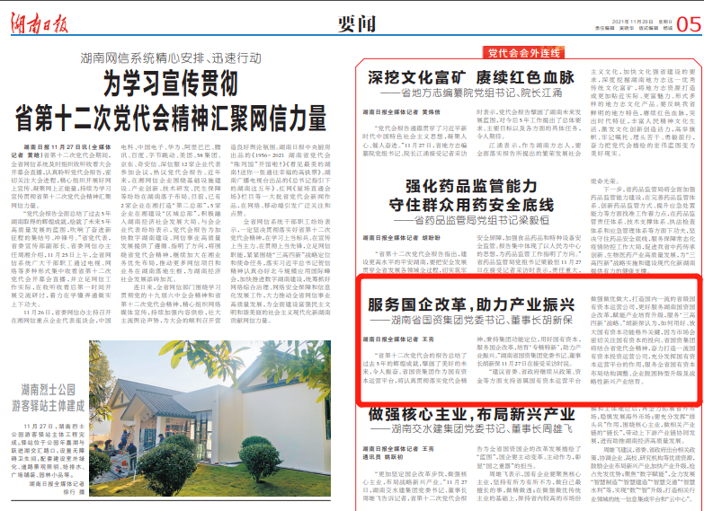 “省第十二次党代会的报告总结了过去5年的辉煌成就,擘画了美好的未来,令人振奋。省国资集团作为国有资本运营平台,将认真贯彻落实党代会精神,秉持集团功能定位,用好国有资本,服务国企改革,培育‘专精特新’,助力产业振兴。”湖南省国资集团党委书记、董事长胡新保11月27日在接受采访时说。