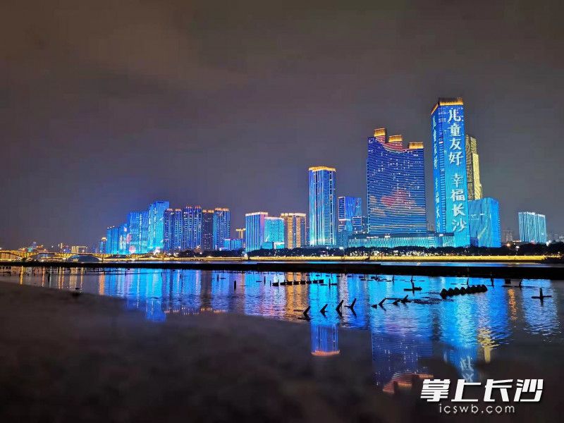 19日-20日,湘江两岸楼宇灯光秀点亮“儿童友好,幸福长沙”等标语。长沙晚报全媒体记者刘攀 通讯员 董静静 摄影报道
