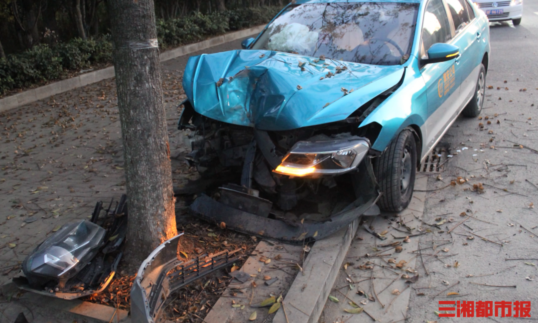 11月24日凌晨5点半,在国道G353线湖岳阳君山林阁佬路段,一台的士在空荡荡的马路上走走停停,突然逐渐向右转向,没有丝毫减速,撞上了路边的大树。