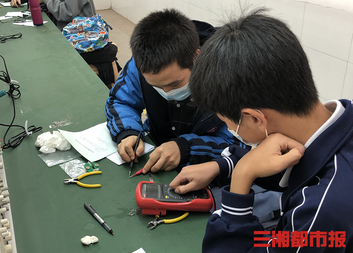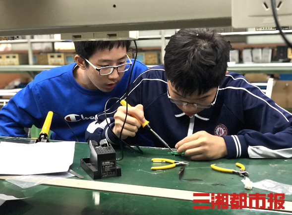 “学长,快来帮我一下,焊点把旁边的给一起焊融了。”“学长,下一步是什么来着,教我一下”……实训室里,除了专业技术老师,还有长沙电子工业学校两名高三学生志愿者,帮助大家解决问题。安装电阻器、用电烙铁将焊点焊接好、安装电池……就这样一步步,发着光、旋转的彩色陀螺安装完成。