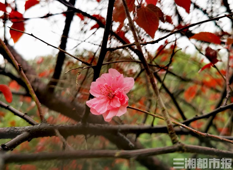 在公园管理处工作人员罗师傅的指引下,记者在园区找到了一片梅花树。梅花树上的树叶掉落得差不多了,零散的开放着梅花,粉中透着红,娇而不艳。尽管开放的花朵并不多,把鼻子凑近闻闻,还是能闻到梅花淡淡的清香。